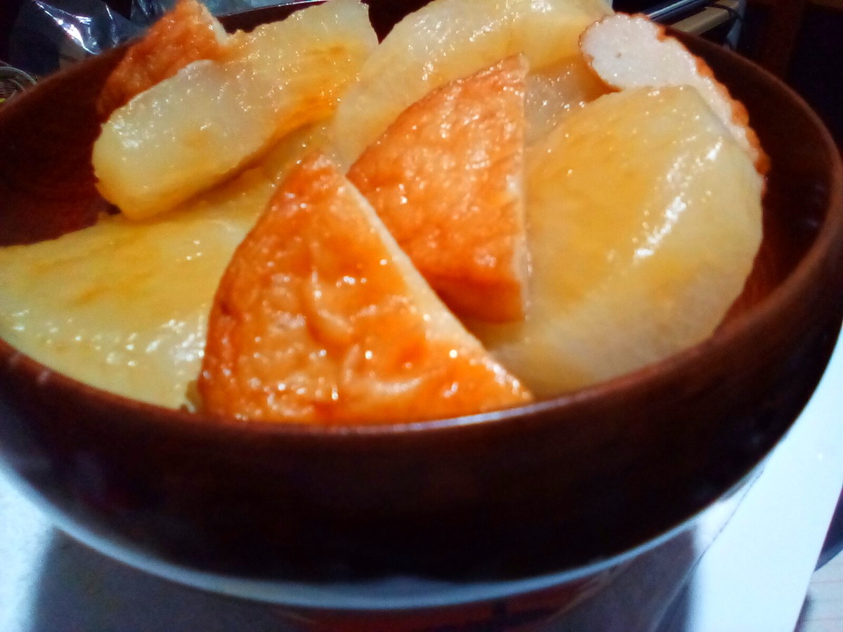 煮物は、さつま揚げから出た旨味が他の具材を美味しくするのですが、さつま揚げは長時間煮込むと旨味が抜けてしまい味がスカスカになるので火を止める15分~20分前にさつま揚げを入れると良いです。